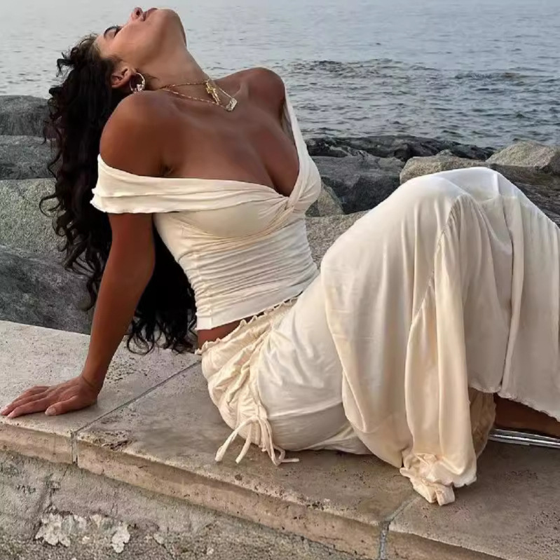 Rompi Model Pendek Dada Rendah Terbuka Pusar Wanita Model Baru Musim Panas Rok Setengah Badan Lipit Elegan Gaya Prancis Setelan Wanita