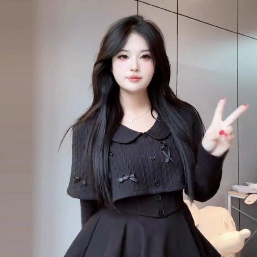 大码女装法式千金风时尚套装女秋冬斗篷蝴蝶结上衣黑色束腰裙套装