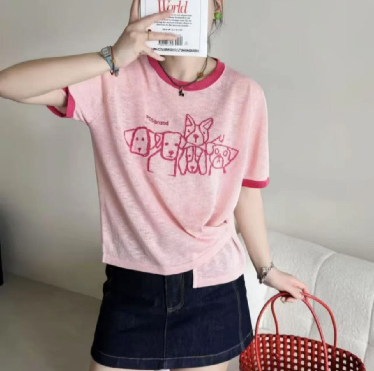 Pakaian Wanita Ukuran Besar 200Kg Atasan Rajutan Bordir Kartun T-shirt Atasan Gaya Sekolah Tidak Beraturan Longgar Manis Musim Panas