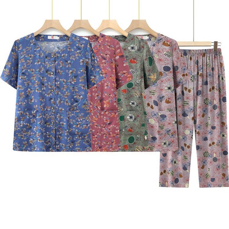 Setelan kardigan musim panas paruh baya dan lansia, setelan pakaian luar lengan pendek katun sutra ukuran plus longgar, pakaian rumah kancing kardigan nenek dan lansia
