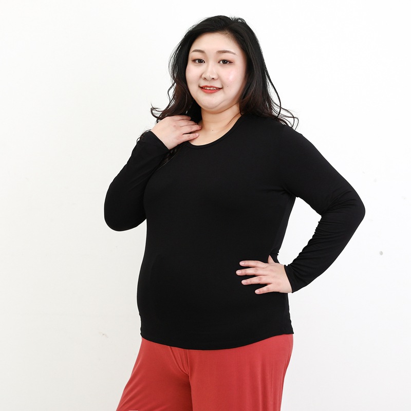 Atasan kaus Dalaman wanita, pakaian ukuran besar leher bulat modal tipis warna solid lengan panjang musim semi dan panas