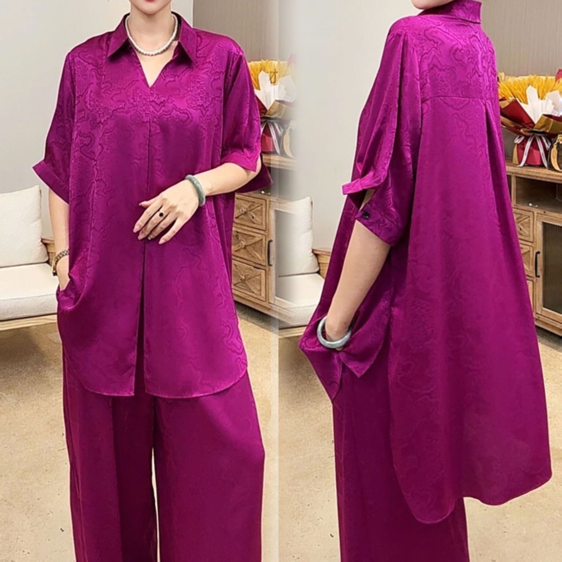 Setelan Dua Potong Ibu Modis Ukuran Besar Musim Panas Model Baru Kemeja Besar Model Lebar Gaya Barat Celana Lurus Menutupi Daging Setelan Longgar Trendi