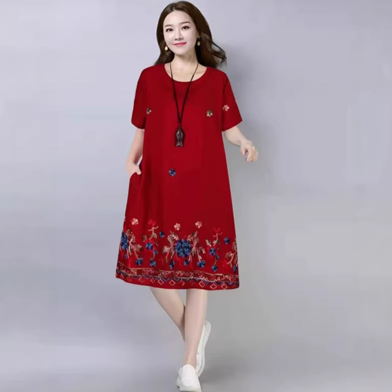 Gaun pantai bersulam wanita ukuran plus, Gaun longgar setengah panjang linen Tencel gaya etnik baru musim panas