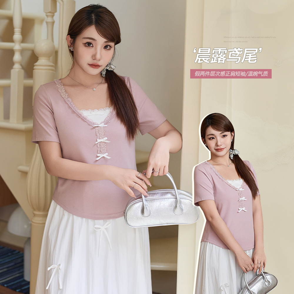 Atasan Pita Kupu-Kupu Kombinasi Renda Palsu Dua Potong Bahu Atasan Wanita Berukuran Besar Wanita Gemuk Kemeja Kecil Terlihat Kurus Longgar Wanita 63877