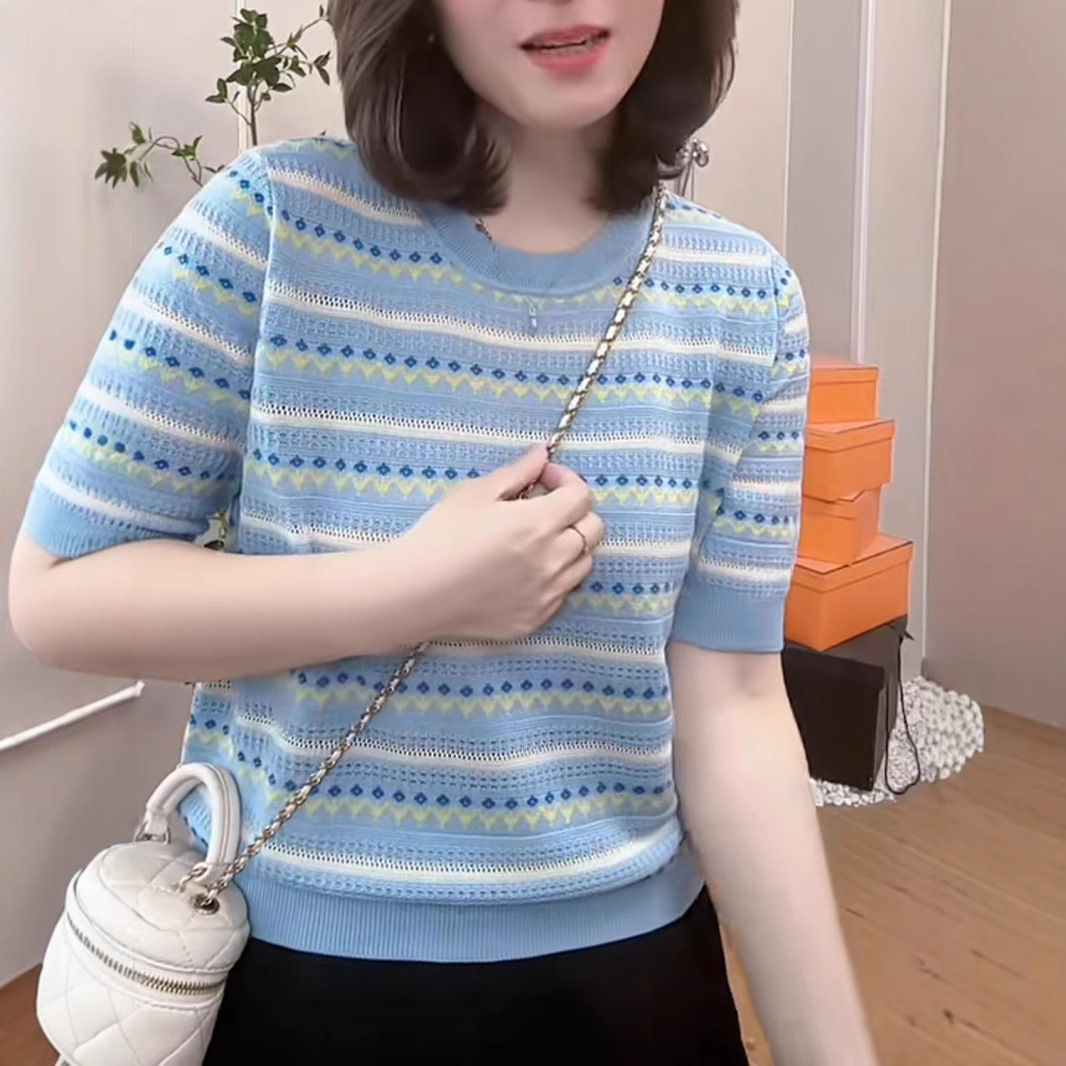 Rajutan Rajutan Rajutan Rajutan Lengan Panjang Reguler Lengan Pendek Gaya Kerja Ringan Atasan Lengan Sedang Berongga Elegan Terlihat Langsing Garis-Garis