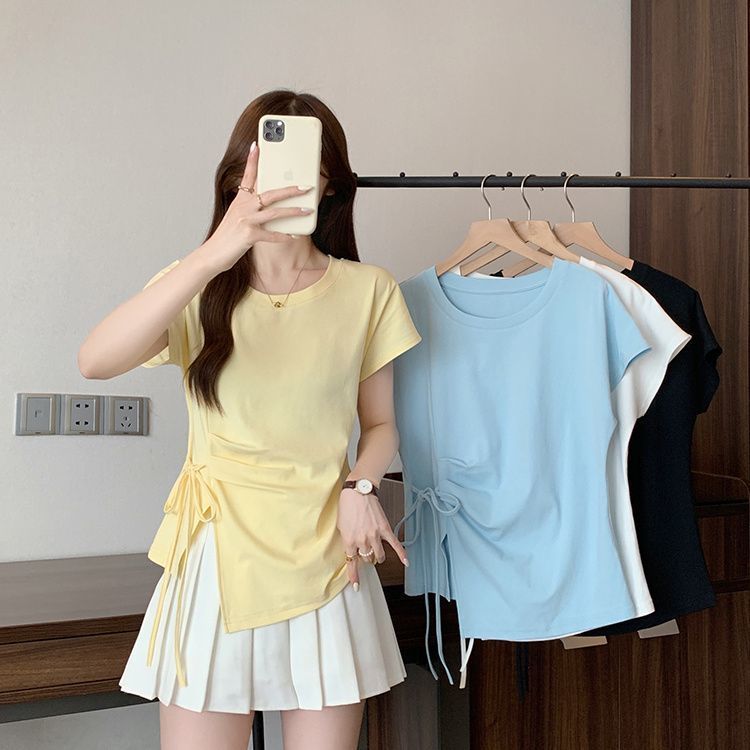 T-shirt Lengan Pendek Bertali Tidak Beraturan Ukuran Besar Wanita Gemuk Lipit Musim Panas Model Korea Terlihat Langsing Atasan T-shirt Wanita