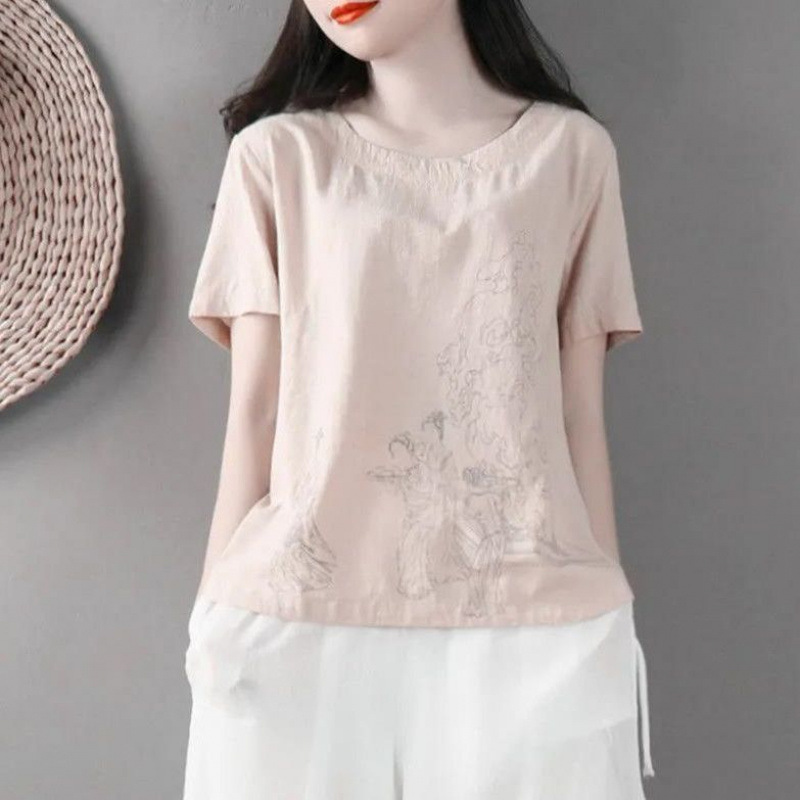 Kaus Lengan Pendek Katun Linen Kaus Kecil Musim Panas Wanita Atasan Ukuran Besar Longgar Kerah Bulat Retro Seni Gaya Tiongkok Kemeja Dalaman Wanita
