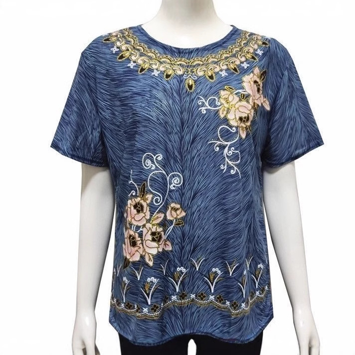 Kaus wanita paruh baya dan lansia, pakaian musim panas, kaus lengan tiga perempat, pakaian ibu usia 50 tahun, longgar, ukuran besar, lengan pendek, pakaian musim panas