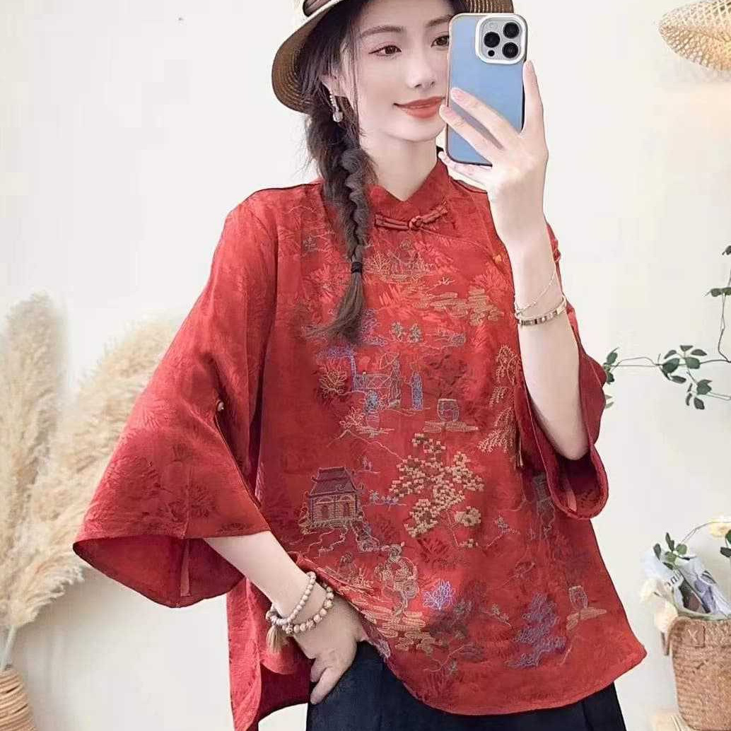 Kaus Kerah Tegak Gaya Etnik Wanita Bordir Lengan Sedang Atasan Ukuran Besar Satin Jacquard Gaya Nasional Musim Panas 2025