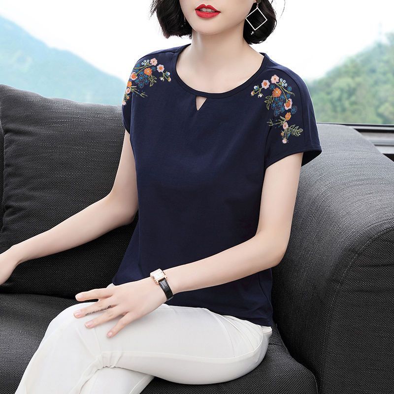 T-Shirt Model Baru 2025 Atasan Bordir Mengurangi Usia Ibu Setengah Baya Lengan Pendek Katun Murni Ukuran Besar Terlihat Langsing Trendi Gaya Tiongkok Baru