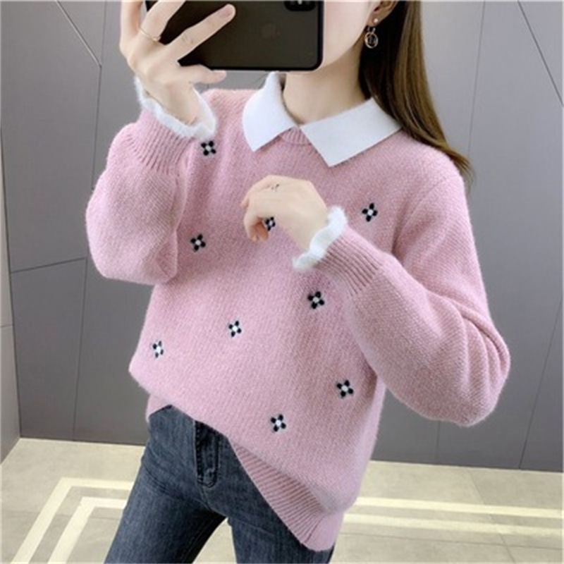 Sweater Wanita 2025 Musim Gugur/Musim Dingin Pakaian Luar Tebal Serbaguna Bergaya Bordir Rajut Longgar Penampilan Awet Muda Atasan Lapisan Dasar