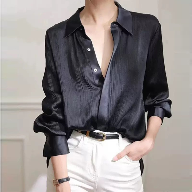 [Stok Tersedia] Pakaian Musim Panas Ukuran Besar Kemeja Lipit Berkelas Tinggi Imitasi Asam Asetat Ukuran Besar Kemeja Wanita Berbahan Satin Gaya Perancis