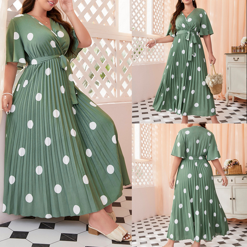 Tersedia Pakaian Wanita Ukuran Besar Timur Tengah Model Baru Musim Semi dan Musim Panas 2025 Gaun Lipit Poldot Elegan Gaun Panjang Kerah V