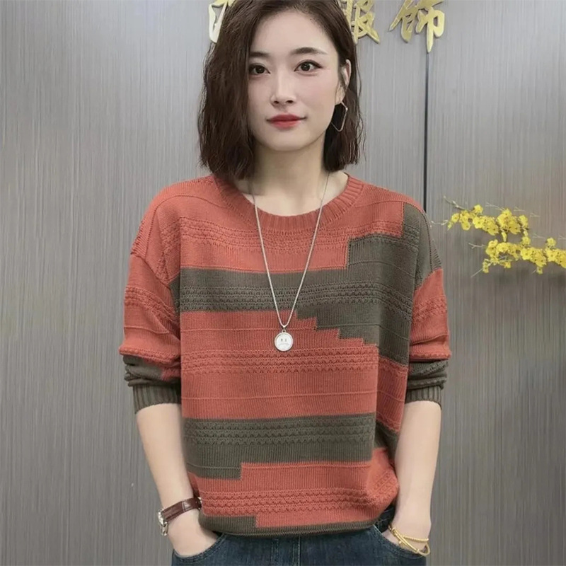 百搭圆领拼色薄款毛衣打底衫春秋新款宽松遮肚洋气针织衫上衣外穿