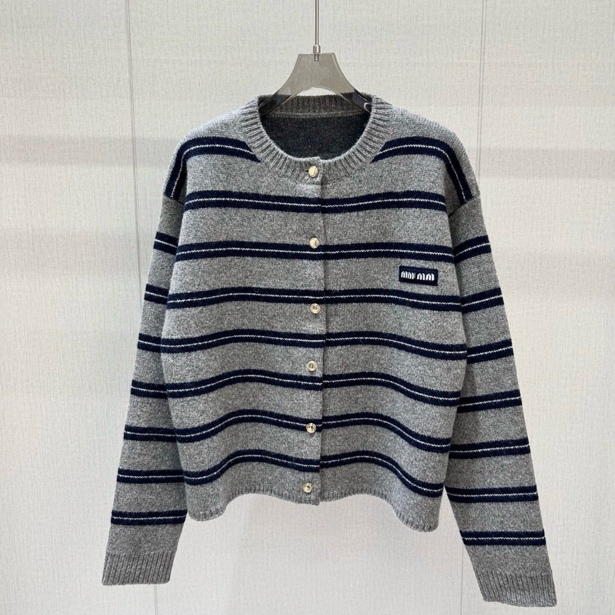 南油新款秋冬灰色条纹针织开衫圆领气质毛衣外套女