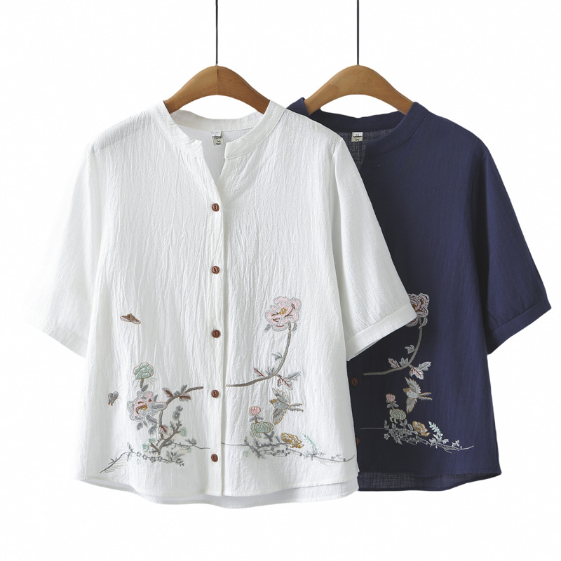 Kemeja Lengan Pendek Musim Panas 2025 Pakaian Wanita Ukuran Besar Bordir Kardigan Gaya Nasional Setengah Kerah Kardigan Kemeja Katun Wanita Gemuk Retro 5220