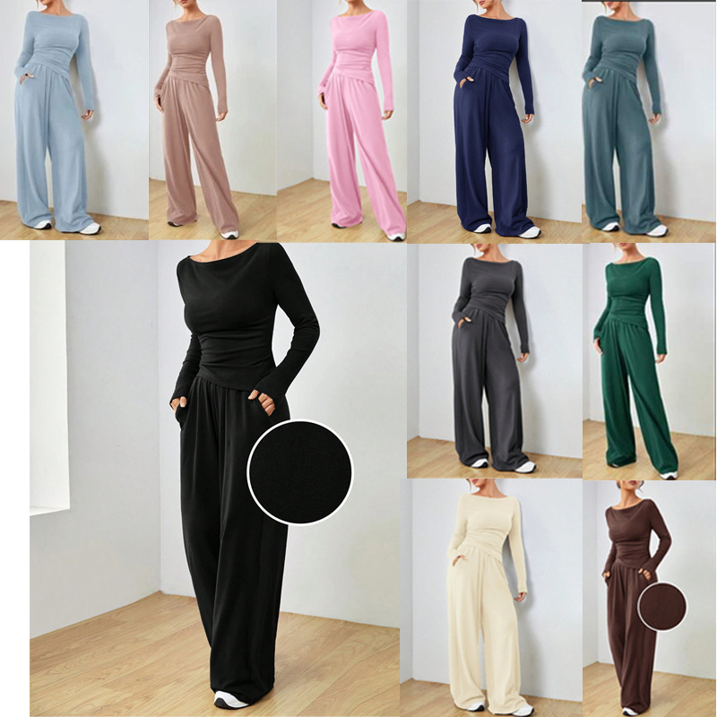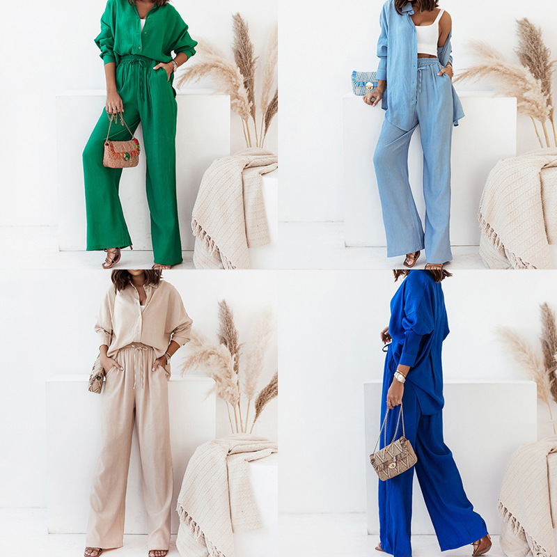 2024 Pakaian Wanita Lintas Batas Eropa dan Amerika Setelan Celana Panjang Kaki Lebar Kasual Lengan Panjang Warna Solid Pakaian Perdagangan Luar Negeri Set Dua Potong Modis