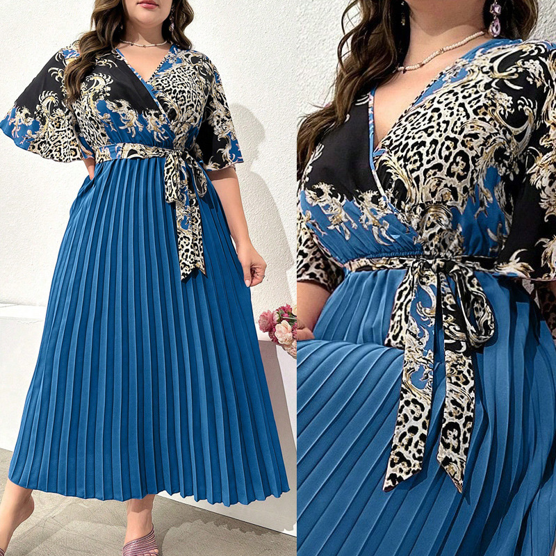 Ready Cross-Border 2025 Amazon AliExpress Eropa dan Amerika Model Baru Musim Semi dan Musim Panas Gaun Fashion Membentuk Pinggang Bercorak Lengan Pendek