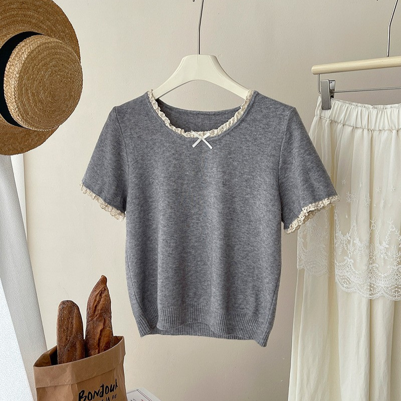 Kaus Rajut Renda Lengan Pendek Sutra Es Model Baru Musim Panas Perancis Kaus Kecil Desain Niche Pakaian Wanita Atasan Wanita