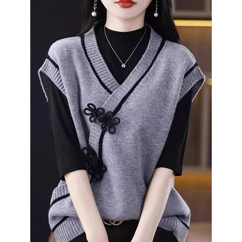 Gaya baru awal musim gugur, rompi tanpa lengan bergaya retro Cina baru dengan kancing, rompi rajutan bergaya dan unik dengan blok warna.