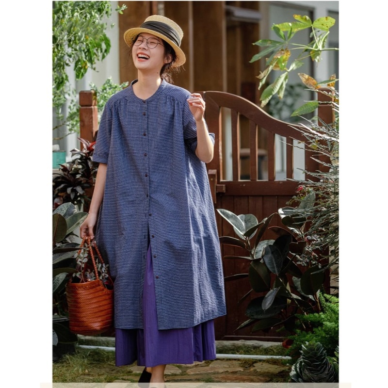 Pakaian Wanita Ukuran Besar Longgar Kasual Artistik Model Baru Musim Panas 2025 Gaun Kemeja Kotak-Kotak Panjang Sedang Dipakai di Lengan Pendek