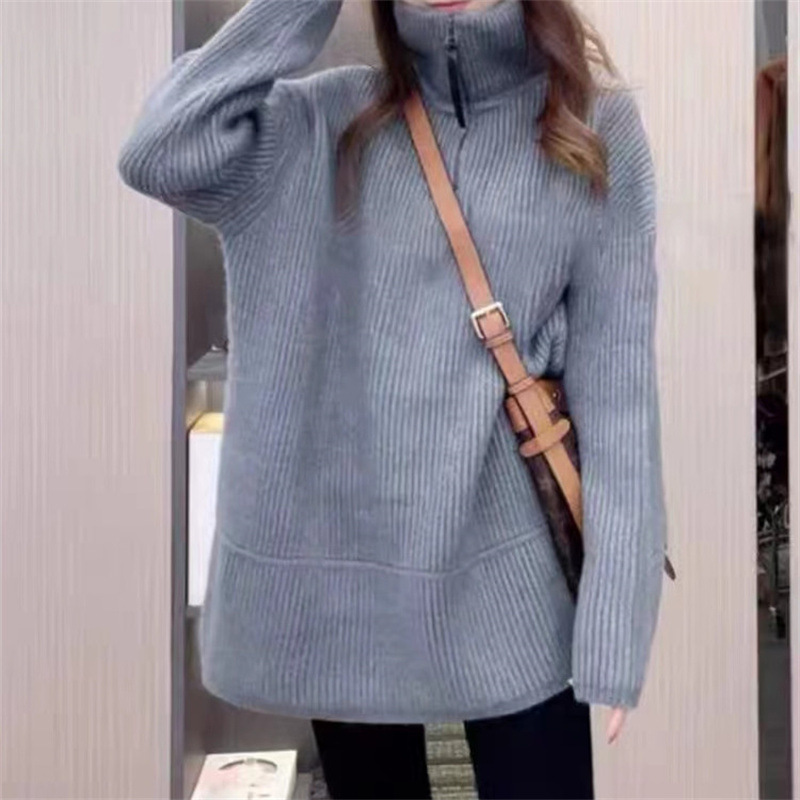 Kemeja dasar rajutan ukuran plus panjang sedang 2024 untuk wanita, sweter kerah setengah tinggi longgar tebal musim gugur dan musim dingin, pakaian dalam yang trendi.