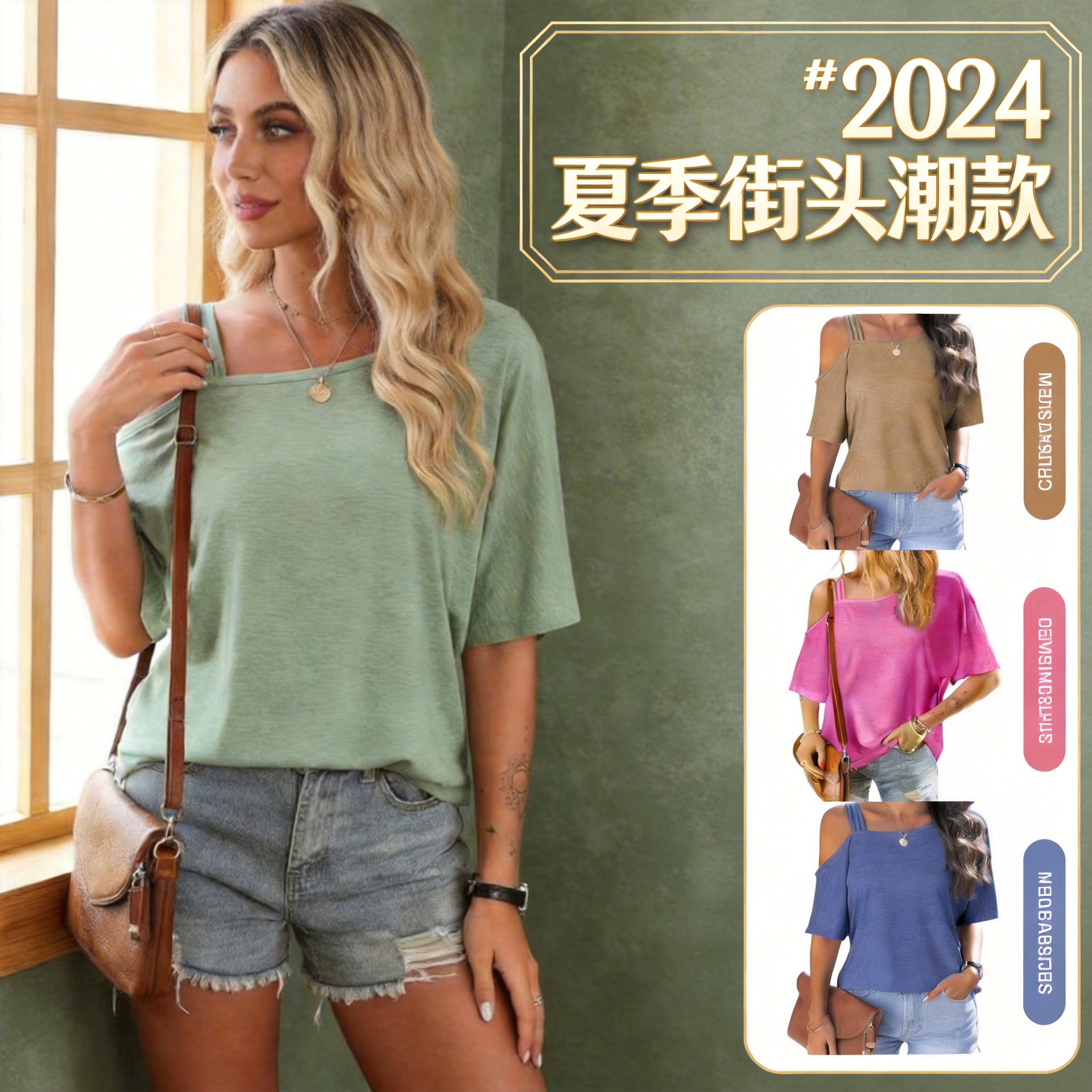 2024 Pakaian Wanita Amazon Kaus Lengan Pendek Longgar Dipakai Luar Bahu Terbuka Kerah Damping Kasual Model Baru Musim Panas Lintas Batas Eropa Amerika