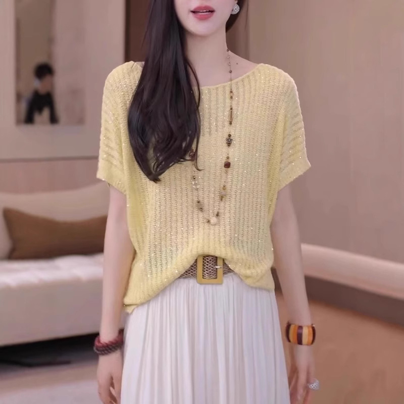 Sweater Lengan Pendek Berongga Payet Ukuran Besar Atasan Unik Super Tampan Longgar Menutupi Perut Wanita Gemuk Model Baru Musim Panas 2025