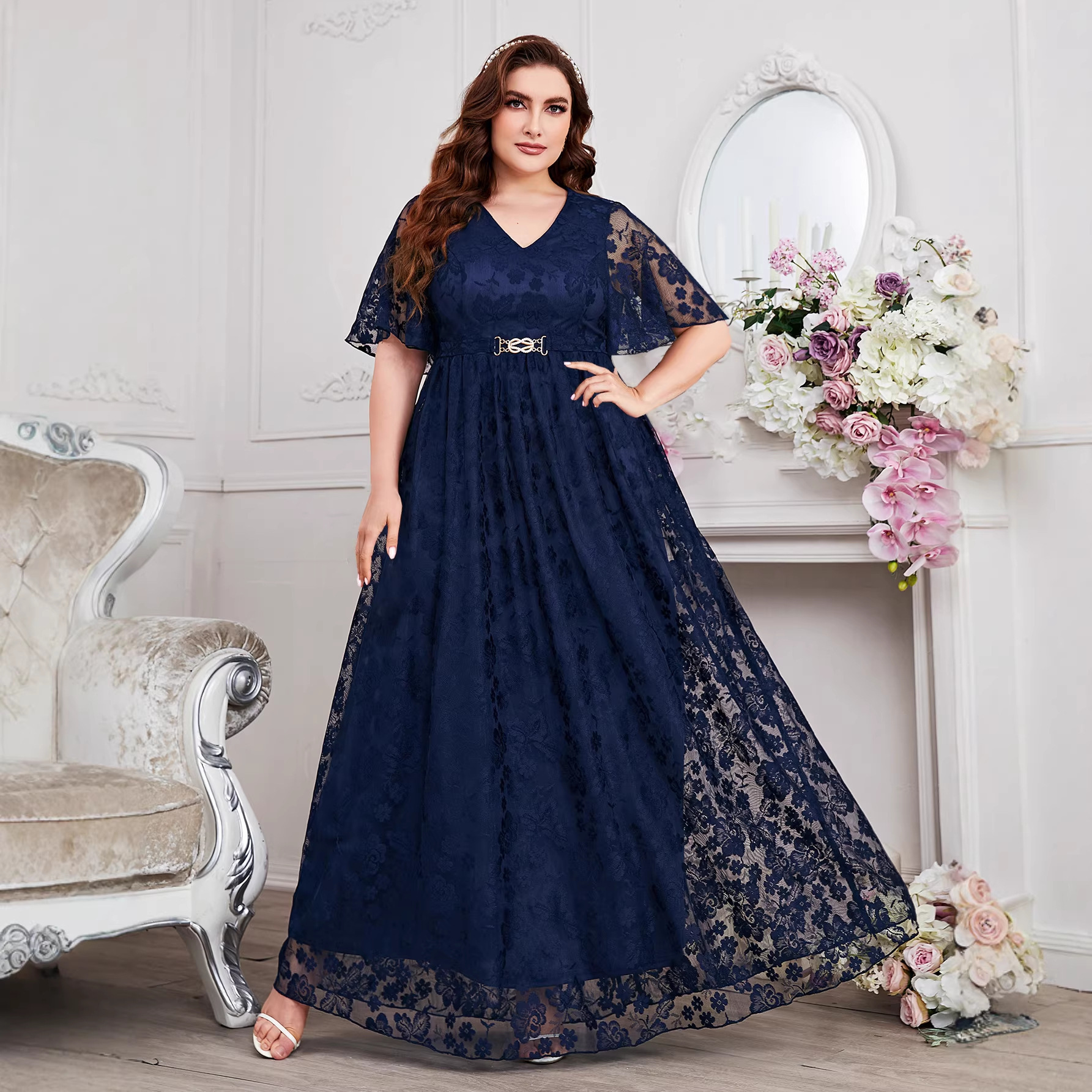 Amazon gaun renda panjang elegan modis pakaian wanita ukuran plus Eropa dan Amerika rok besar V-neck stasiun independen lintas batas