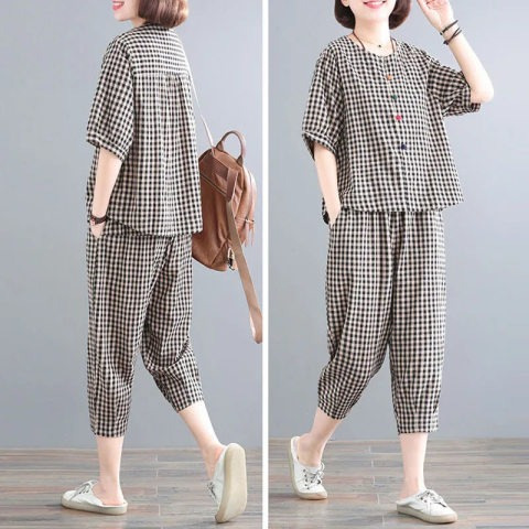 Setelan pakaian wanita ukuran plus, pakaian retro wanita ukuran besar longgar baru mode 2023, set dua potong, baju kotak-kotak kasual wanita, musim panas