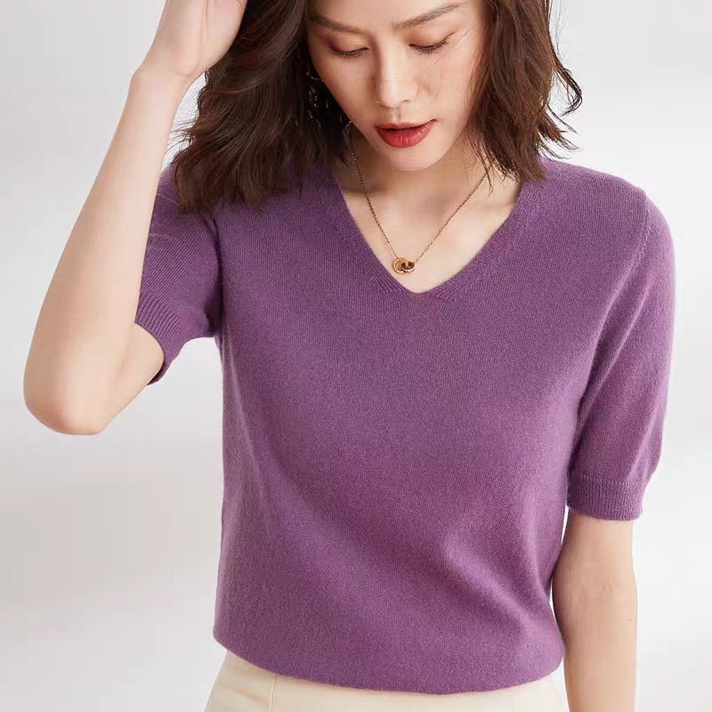[Clearance] rajutan kerah V Wanita Musim Semi dan Gugur pullover lengan pendek longgar pelangsing bottoming warna solid sweater tipis