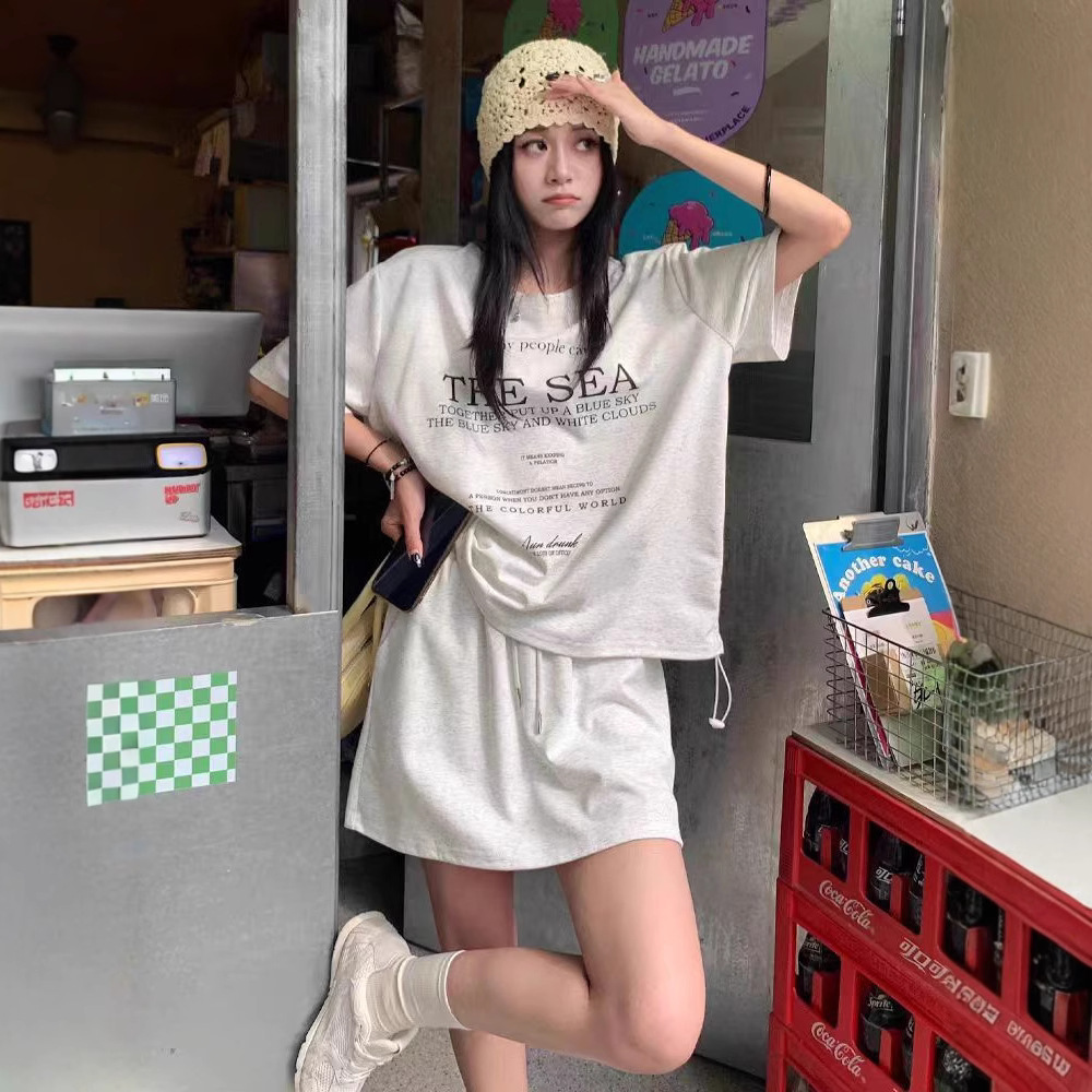 Setelan Gaya Olahraga Kasual Versi Korea Wanita Musim Panas Longgar Mengurangi Usia Tali Serut Lengan Pendek Menutupi Pinggul Rok Pendek A-Line Dua Set Trendi
