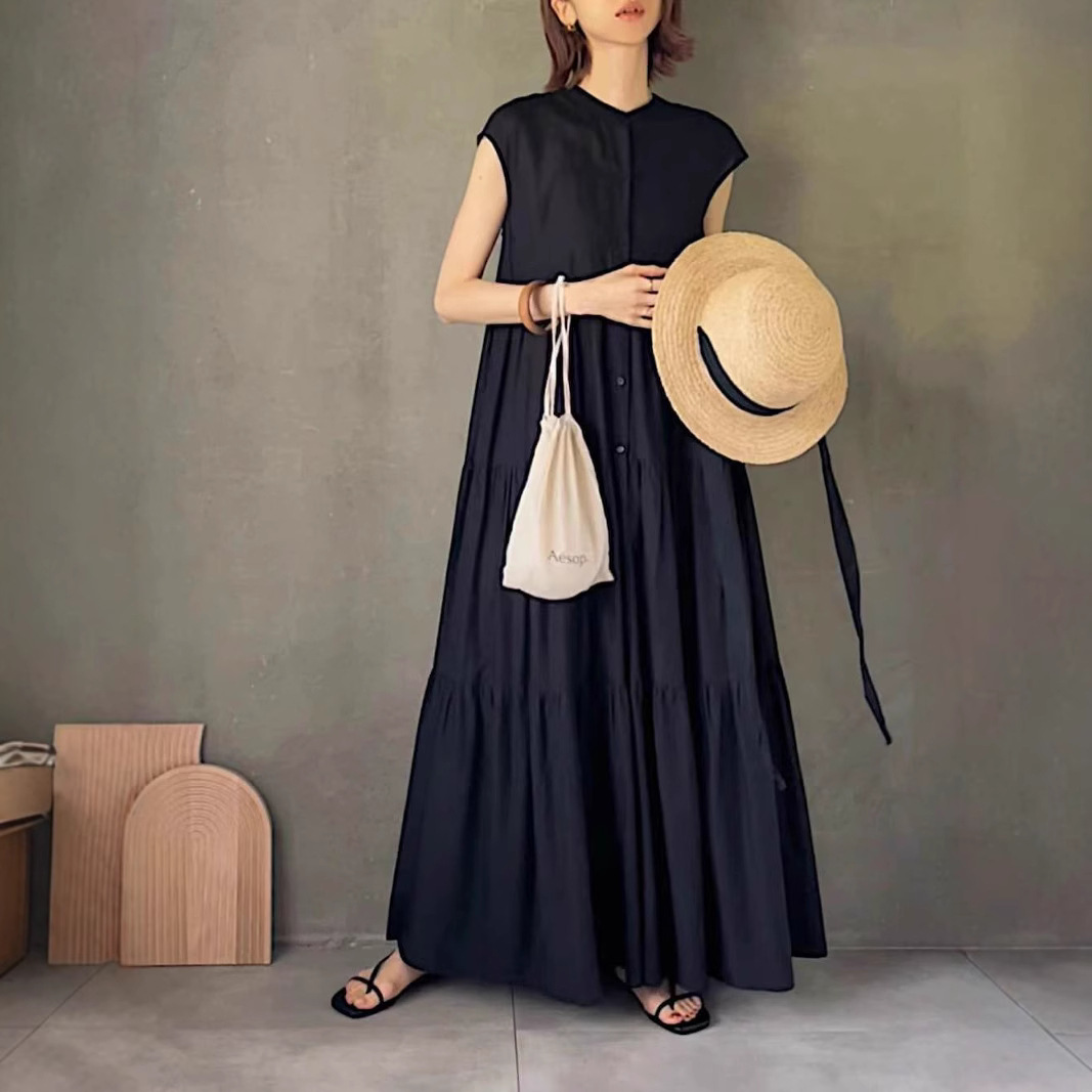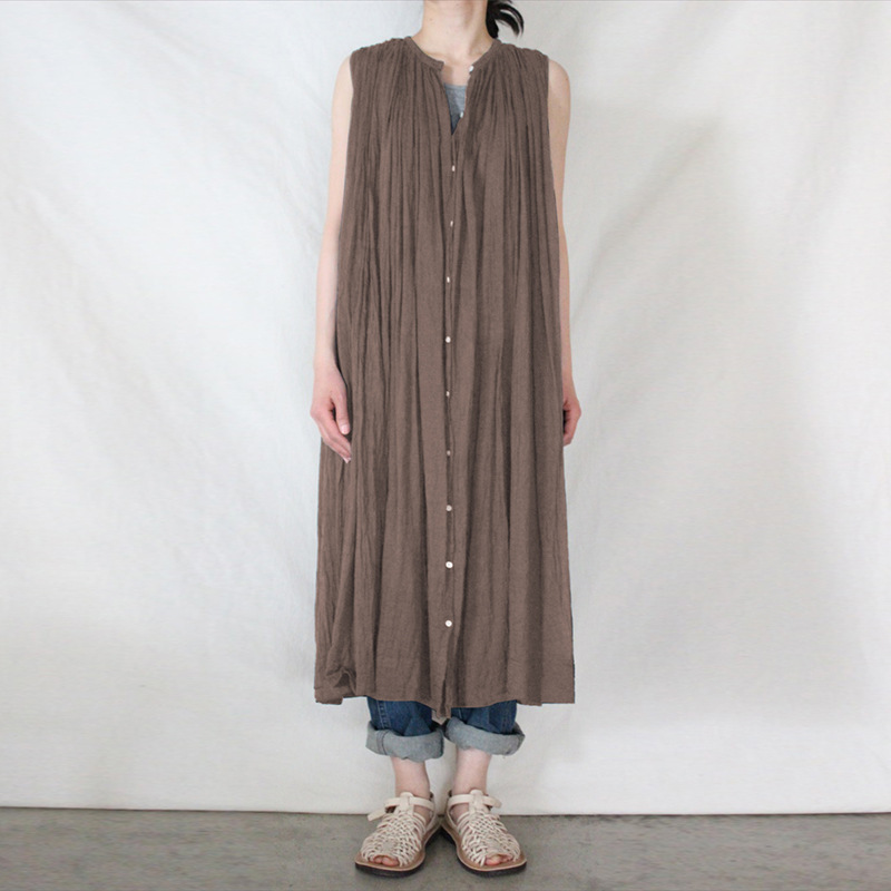 Gaun tanpa lengan Niche blus tipis kerah berdiri ayunan besar berlipat longgar artistik katun murni musim panas baru