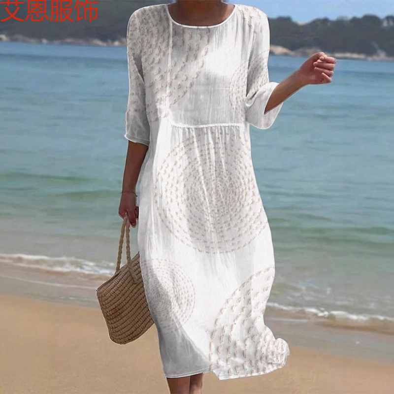 Pakaian Wanita Eropa dan Amerika Model Baru Musim Panas Lintas Batas Gaun Bersablon Lengan Panjang Modis Kerah Bulat Longgar