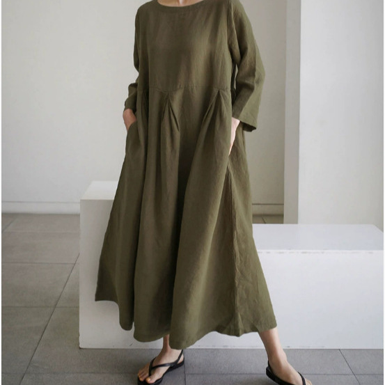 2024 Cross-Border Musim Semi Model Baru Amazon AliExpress Pakaian Wanita Ukuran Besar Gaun Lengan Panjang Kerah Bulat Katun Linen