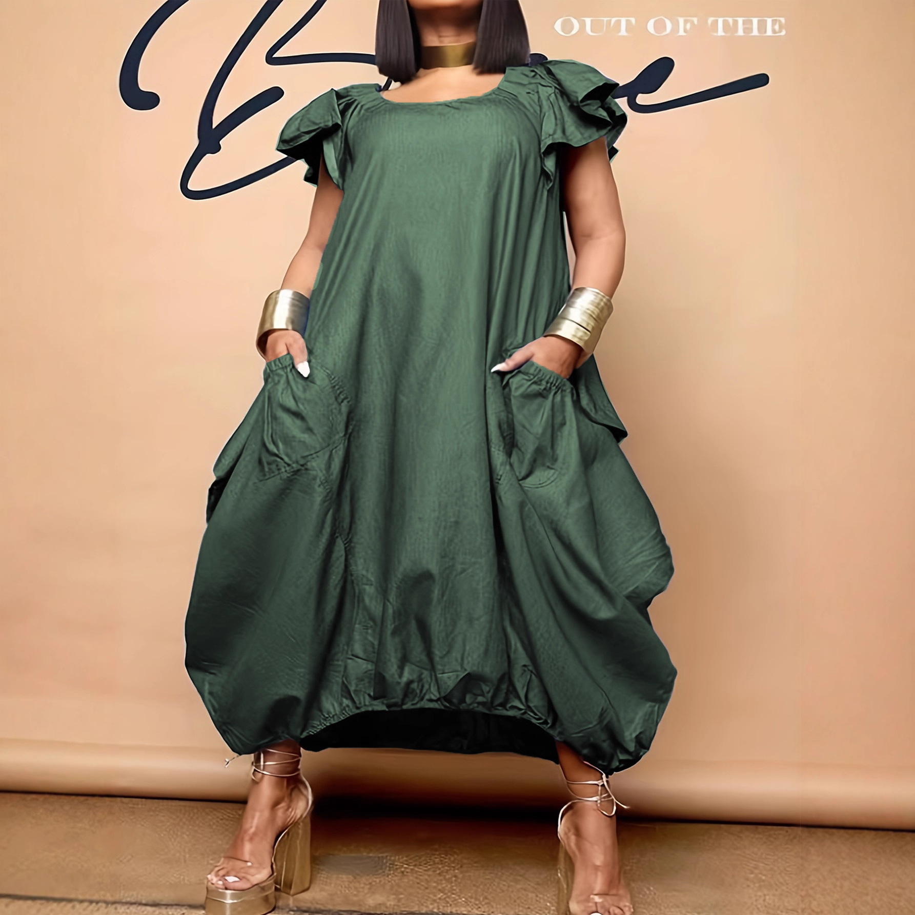 Gaun stasiun independen Amazon lintas batas Eropa dan Amerika 2024 pakaian wanita ukuran plus kerah sendok warna polos baru gaun lengan sayap kelelawar