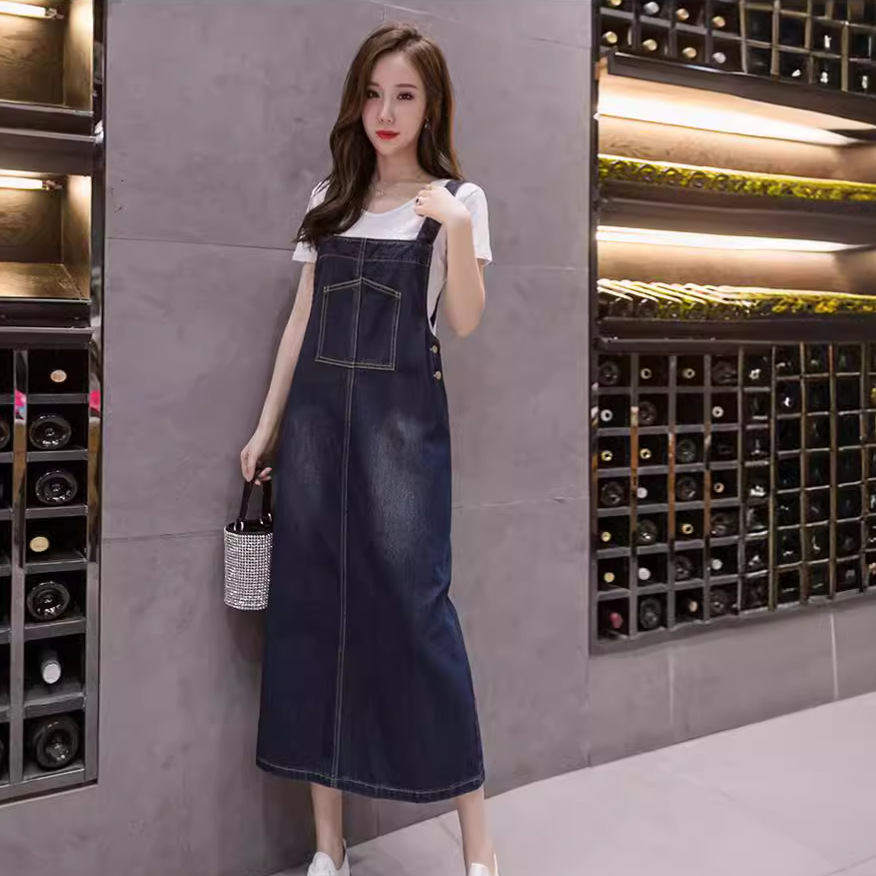 Real shot gaun wanita gemuk gaun suspender Denim panjang sedang musim panas cinta pertama Prancis manis untuk wanita 1688
