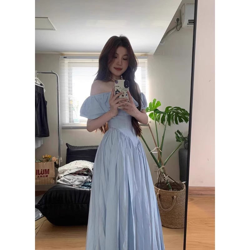Gaun Wanita Gemuk Gaya Hepburn Pakaian Musim Panas Wanita Ukuran Besar Lengan Busa Gaun Panjang Di Bawah Lutut Elegan Terlihat Langsing Pinggang Kerah Persegi