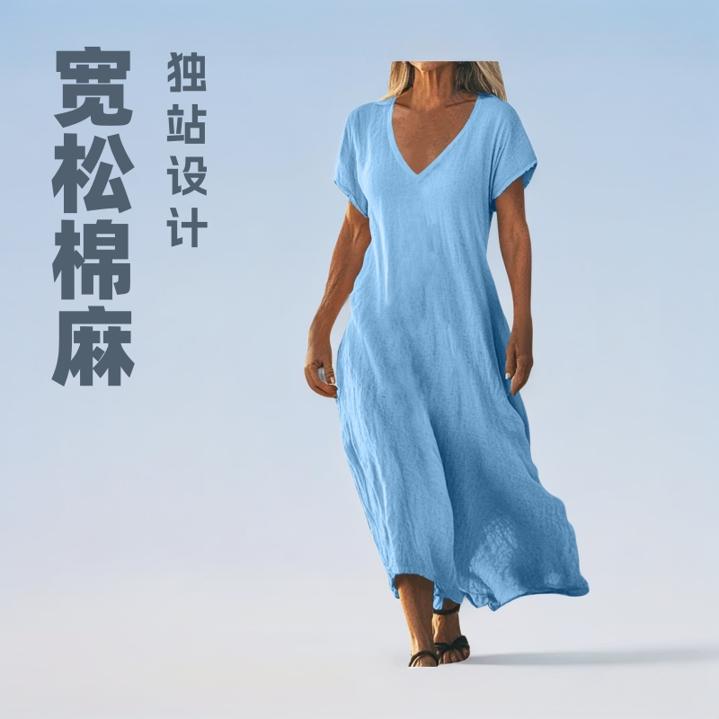 Pakaian Wanita Gaun Longgar Lengan Pendek Kerah V Katun dan Linen Model Baru Stasiun Independen Amazon Musim Semi dan Musim Panas 2025