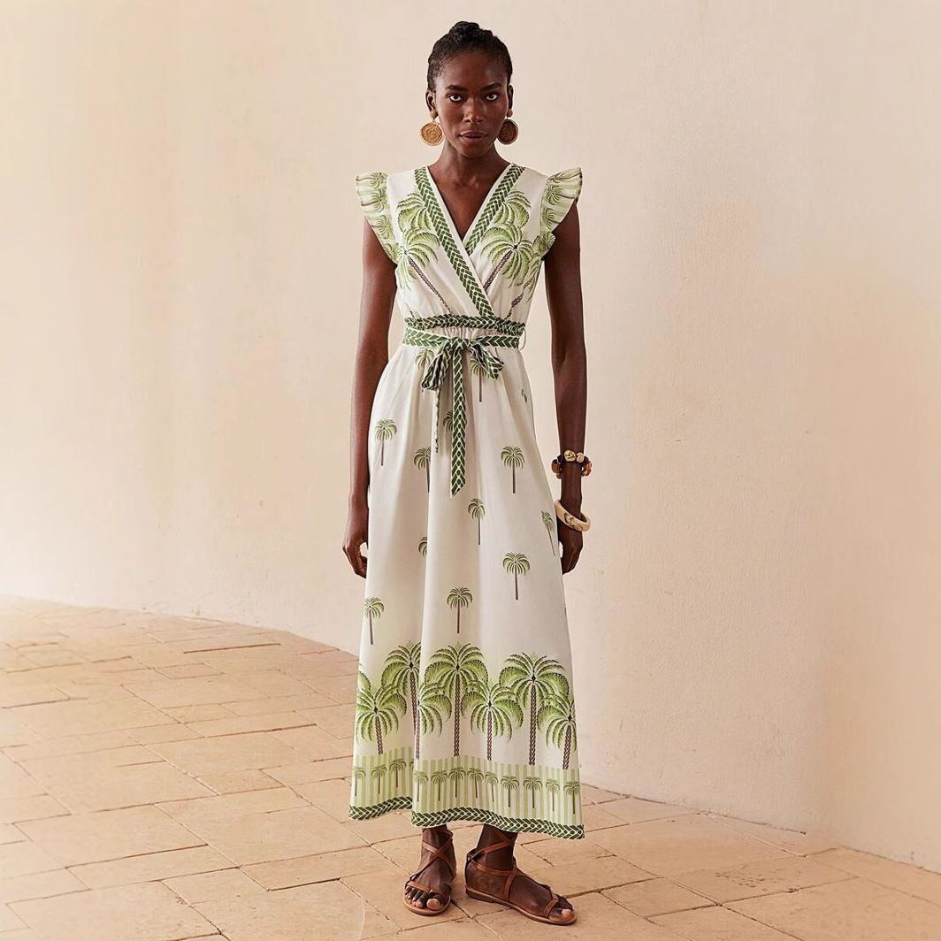 Gaun Lengan Eyangan Motif Bunga Pohon Palem Ukuran Besar Gaya Liburan Perdagangan Luar Negeri Eropa dan Amerika Lintas Batas Model Baru Musim Panas 2025