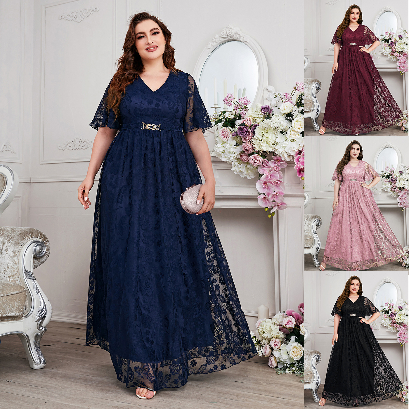 Amazon gaun renda panjang elegan modis pakaian wanita ukuran plus Eropa dan Amerika rok besar V-neck stasiun independen lintas batas