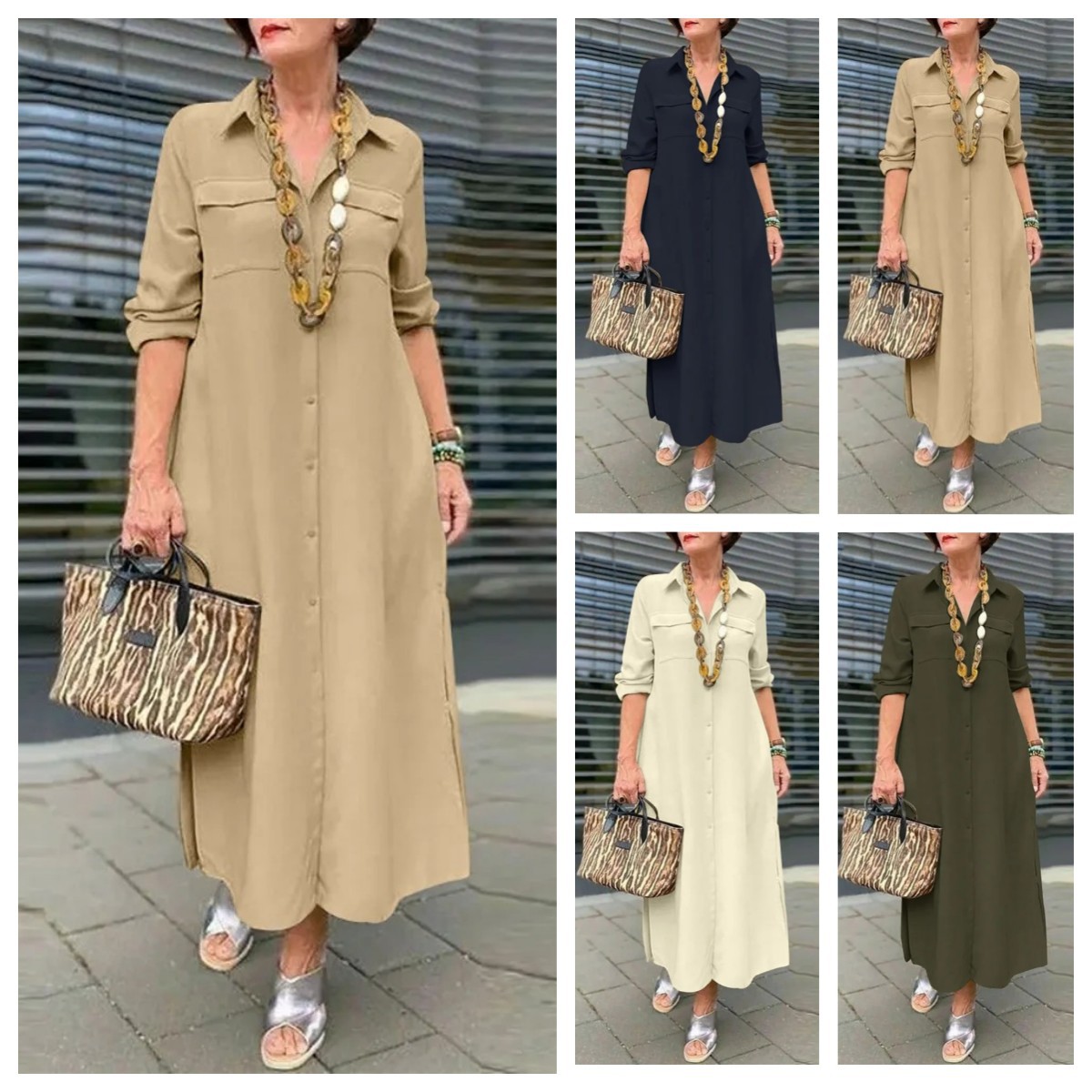 Gaun wanita lengan panjang, pakaian wanita ukuran plus, kerah kancing, lengan panjang, warna polos, elegan, baru, Aloi AliExpress, 2023