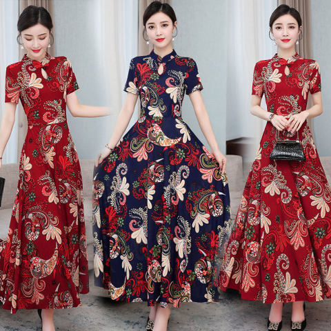 Ibu gaun cheongsam, baju cheongsam ukuran plus untuk wanita, leher V lengan pendek, pinggang ketat cetak gaya Korea, musim panas