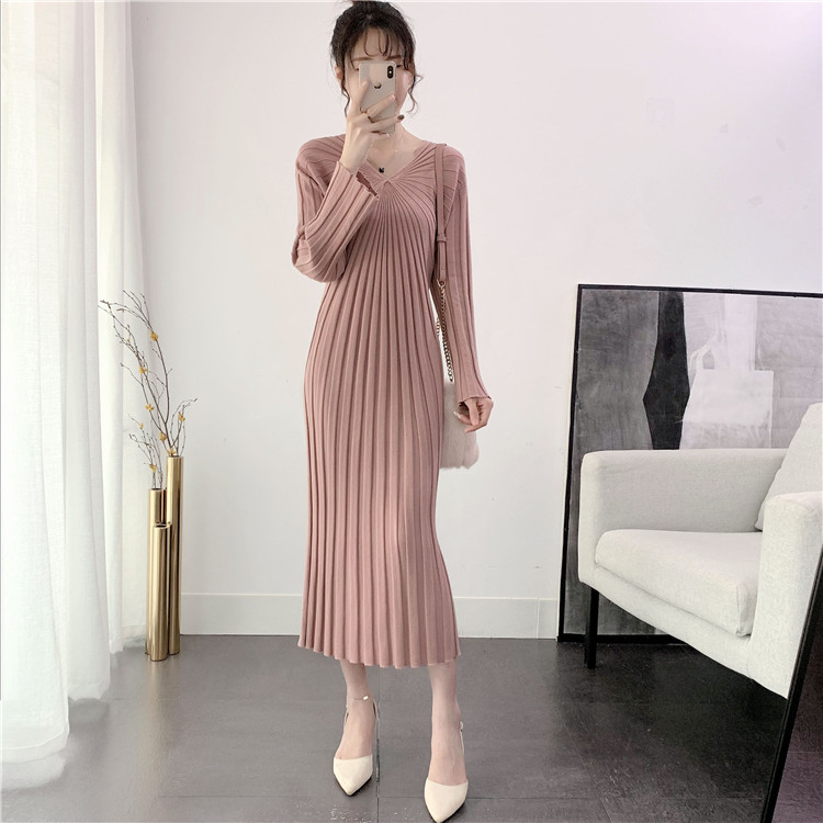 Gaun rajut longgar ukuran besar model baru musim gugur 2025, panjang selutut, elegan bergaya dewi, model sweater dengan kerah V, untuk musim dingin