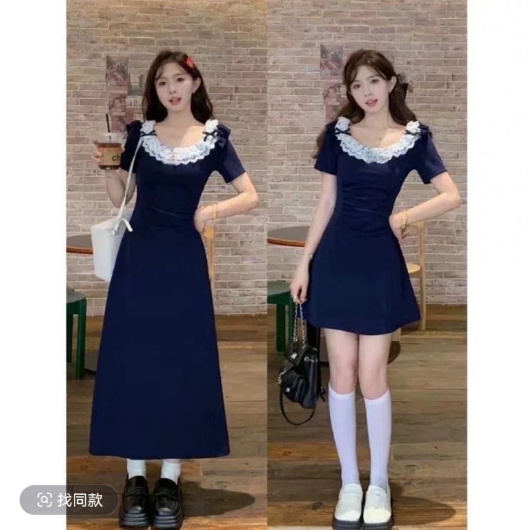 7974 Xuanchen Gaun Lengan Pendek Elegan Gaya Prancis Komuter Ukuran Besar Gaya CHIC Gaun Panjang Terlihat Langsing Membentuk Pinggang Model Musim Panas