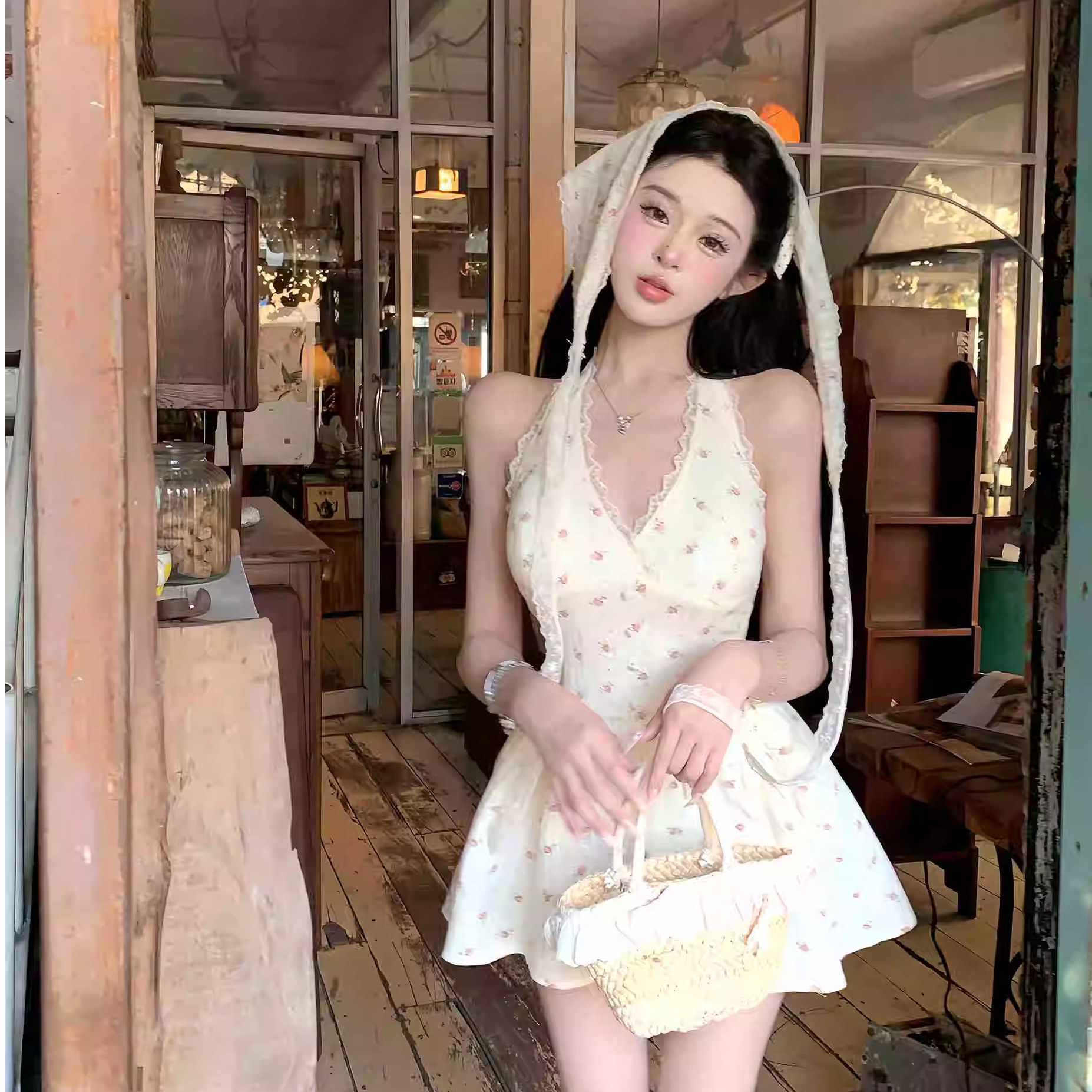 Gaun Gantung Leher V-neck Gaya Desain Gadis Pedas Cantik Lemak Rok Pendek Liburan Bunga Selangit Pinggang Murni Musim Panas Wanita