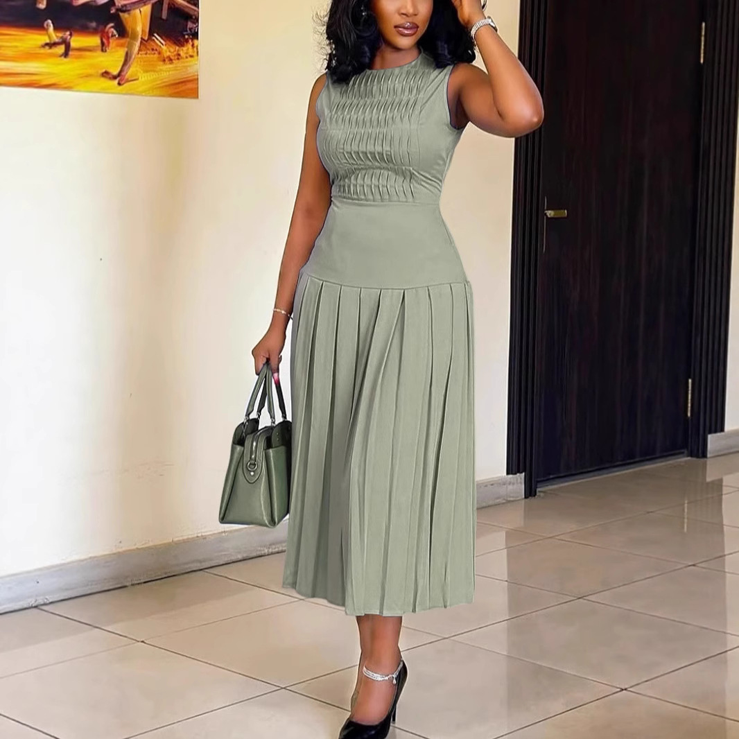 Gaun Lipit Tanpa Lengan Warna Solid Kasual Lintas Batas Eropa Amerika