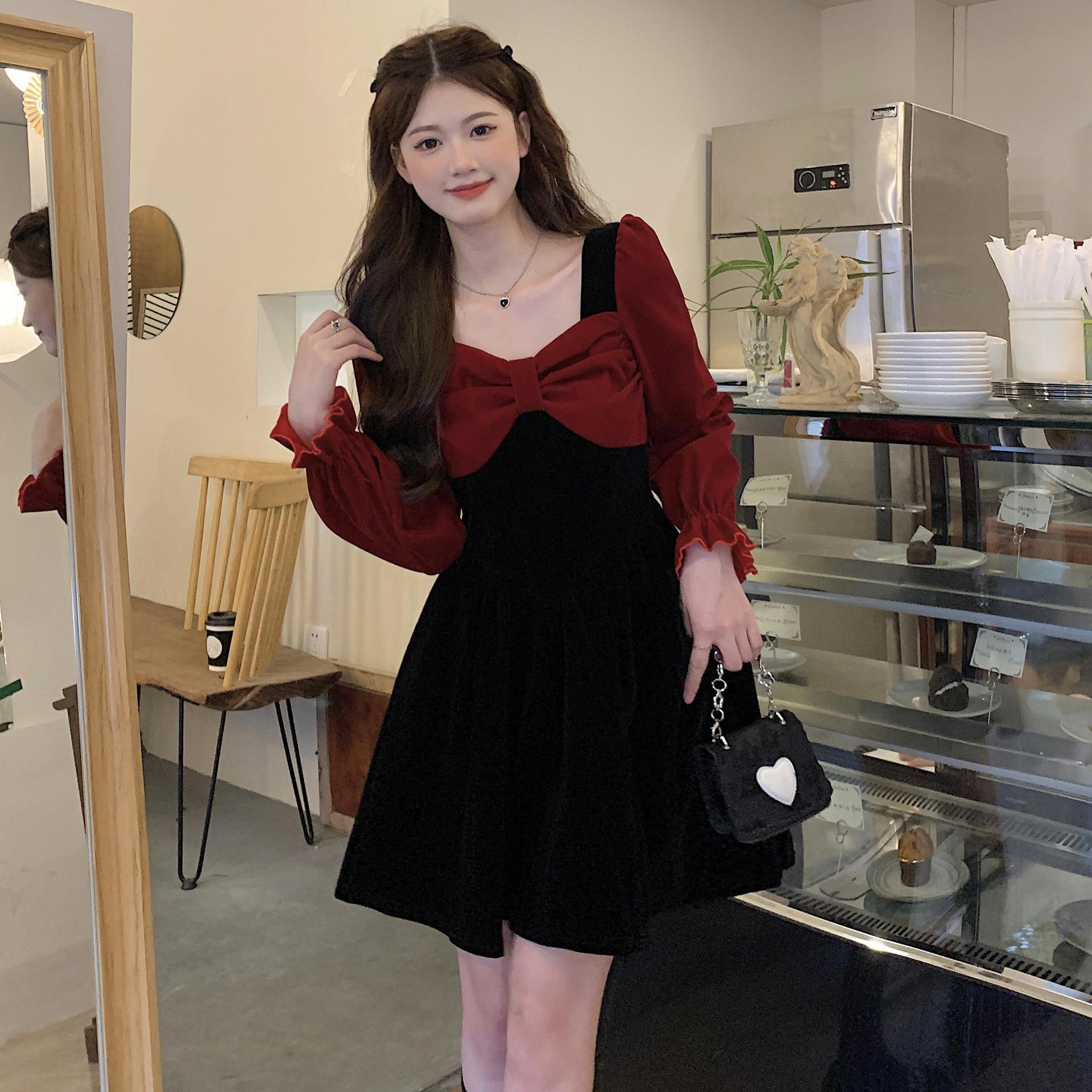 Gaun beludru dua potong palsu wanita, gaun warna merah retro pinggang gemuk musim semi dan musim gugur ukuran besar