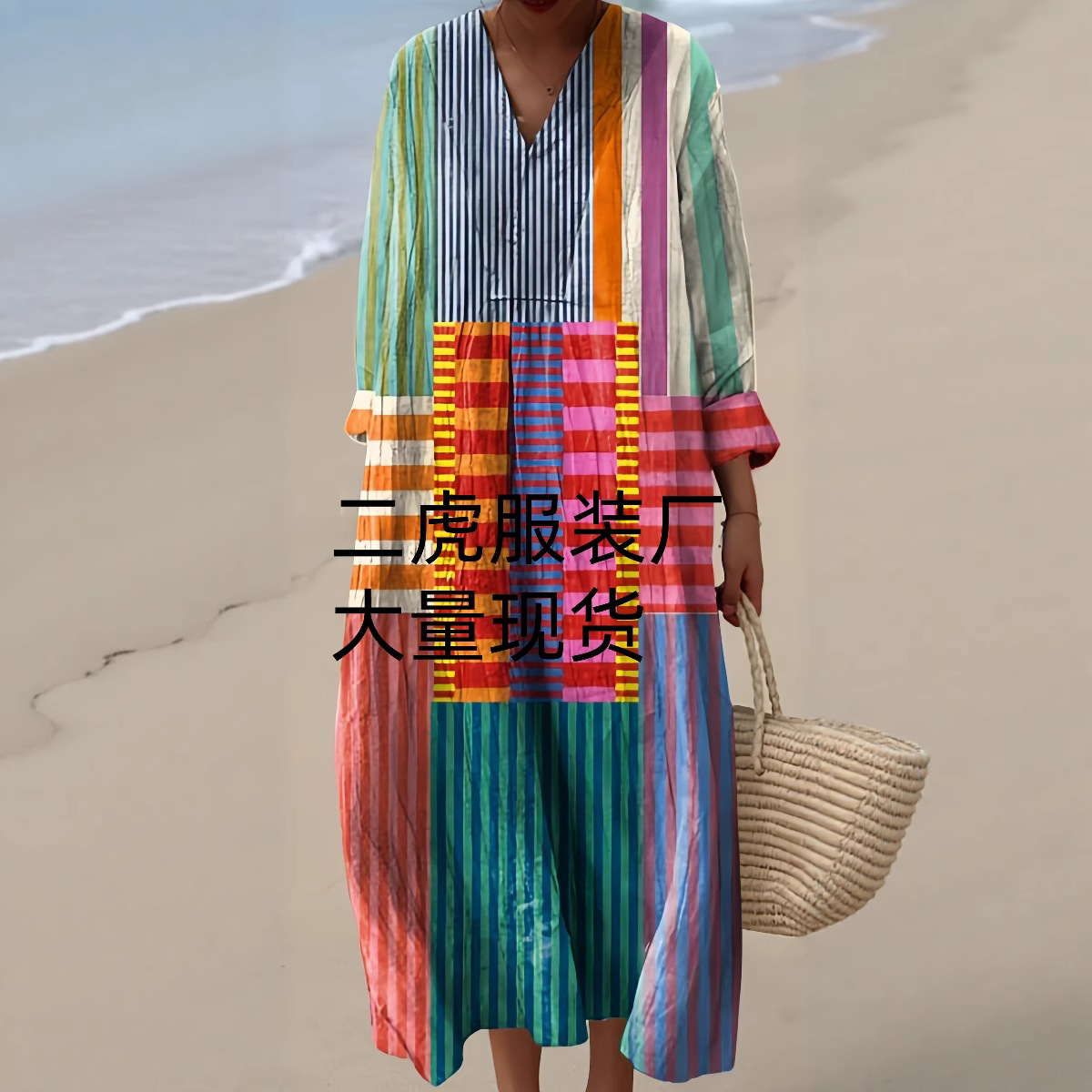 Gaun pantai wanita perdagangan luar negeri lintas batas Eropa dan Amerika 2024 Amazon stasiun independen musim panas kasual leher-v