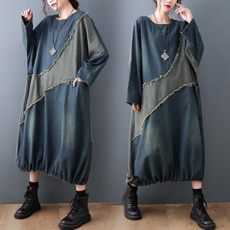 Dress panjang Denim, Gaun panjang Denim awal musim gugur untuk pergelangan kaki tipis a-line ukuran besar, pinggang tinggi gaya Barat pelangsing chubby perempuan lengan panjang